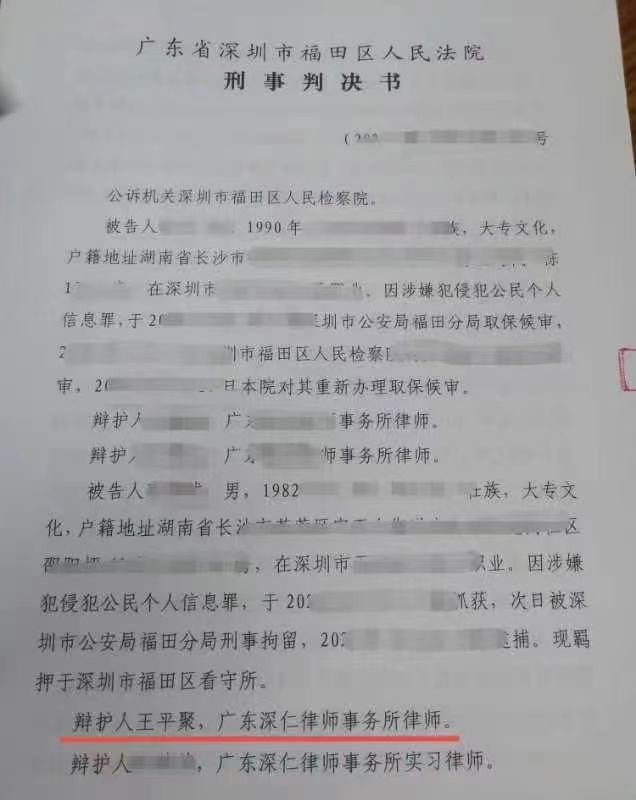 王平聚律師辯護的某企業負責人涉嫌侵犯公民個人信息罪在檢察院認罪認罰建議量刑三到四年的基礎上,一審法庭接受其意見剔除合法獲取信息的部分最后判一年七個月。